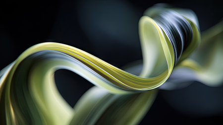 A flowing abstract shape dominates the frame, rendered with smooth gradients of green, yellow, and a touch of blue. The elegant curves are set against a dark, blurred backdrop, enhancing the sense of depth. This image could be suitable for various commercial or artistic applications.