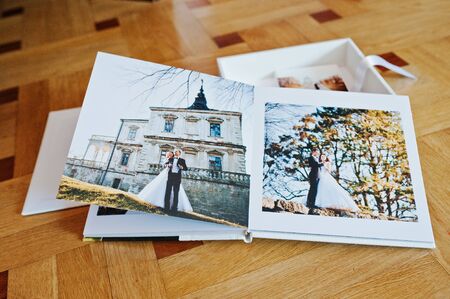 Luxury white leather wedding photo album and photo book.