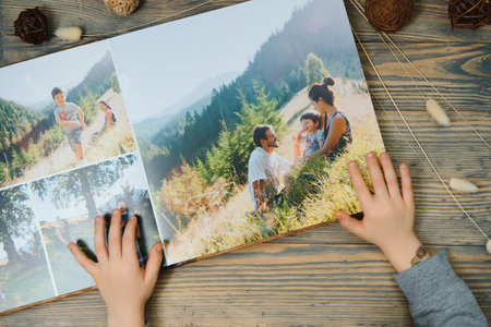 the Hand man holding a family photo album against the background of the a wooden table