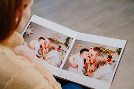 Beautiful young woman sitting on the floor near nicely decorated Christmas tree, looking through an old photo album while spending Christmas Eve at home.