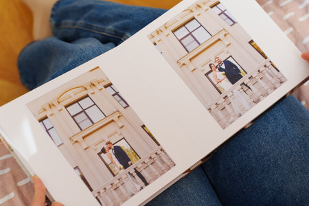 Female hands flipping through a photo book with wedding photos