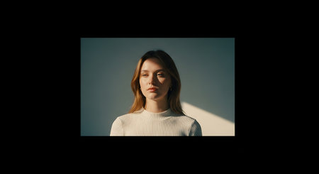 A close-up portrait of a young woman with short blonde hair, wearing a stylish coat, looking directly at the camera with a neutral expression, soft lighting, minimalistic background