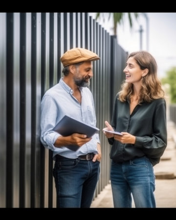 Generative AI : Two smiling young man and woman business colleagues dressed in formal clothes discussing work while standing outsisde with digital tablet and documents in hands che