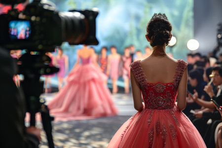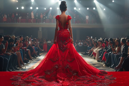 Model in Red Haute Couture Dress, Walking Runway Show, Audience, Fashion Event Concept.