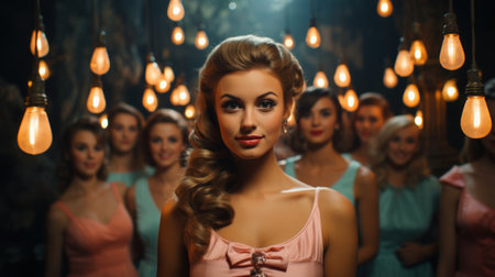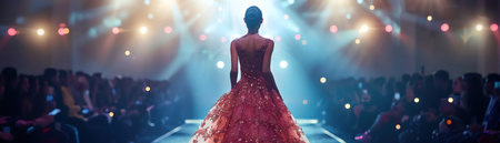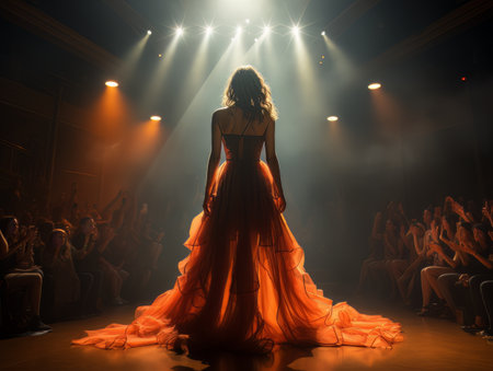 Young fashion model runway catwalk fashionable dress industry elegance performance show stage clothing agency style standing stylish glamourous spotlight trendy autumn summer season dress couture