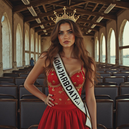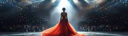 Elegant woman in a sparkling red gown stands on stage, illuminated by golden spotlights. The audience watches in admiration as she captivates the crowd with her grace and poise