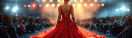 Elegant Fashion Show Young Model in Red Gown on Runway, Delighted Audience in Background