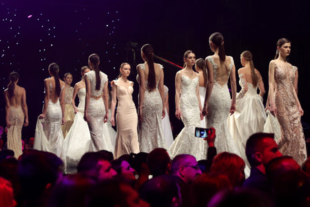 Sofia, Bulgaria - 23 March 2017: Female models walk the runway in different dresses during the Sofia Fashion Show. Fashion catwalk event showing new collection of clothes.
