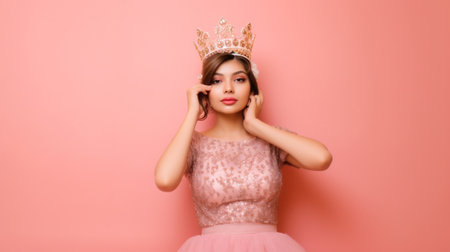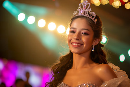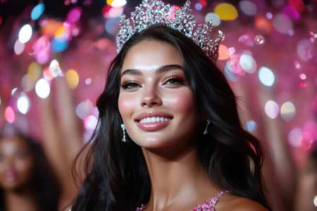 Smiling 21 years old hispanic female with crown at festive beauty pageant contest celebration.