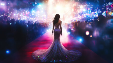 A woman in a luxurious evening dress walks the red carpet, surrounded by flashing lights and celebrities at a glamorous event. -