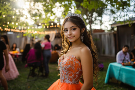 Hispanic teenager celebrates quinceanera in backyard surrounded by family and friends