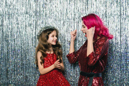 Young elegant woman in golden glitter dress. evening makeup holding glass of champagne and celebrating over red studio background.