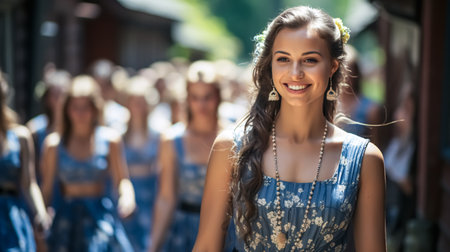 Portrait of a beautiful brunette girl in a blue dress on the street. Swedish Midsummer Festival