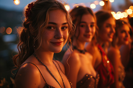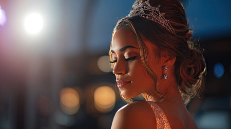 This stunning portrait captures an elegant young woman wearing a tiara and sparkling makeup, radiating beauty and grace in soft evening lighting.