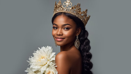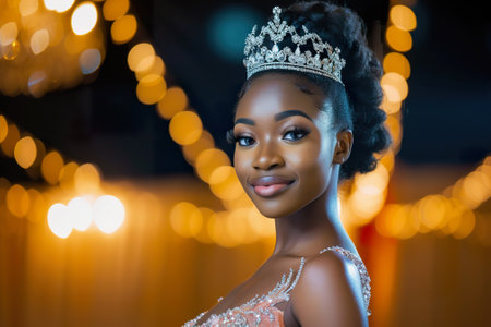 Elegant Black winner of beauty pageant contest, blurred stage background.