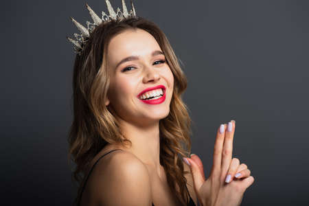 happy woman in tiara with diamonds showing gun gesture with hands on gray