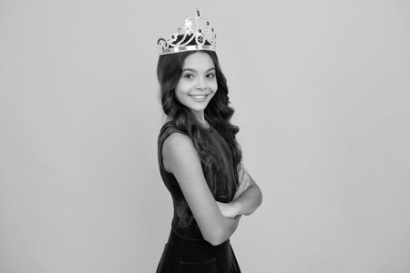 Teenager princess child celebrates success win and victory. Teen girl in queen crown. Happy girl face, positive and smiling emotions.