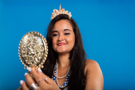 Portrait of beautiful black-haired woman wearing white clothing, smiling, holding and looking into a mirror. Devotee of iemanja.