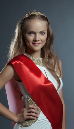 Portrait of smiling pretty girl with winner ribbon, close-up