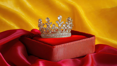 A stunning diamond tiara elegantly placed on rich burgundy satin fabric, showcasing its exquisite design and glamour, perfect for fashion and jewelry themes.