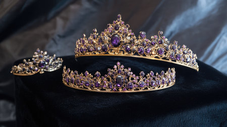 Stunning set of three elegant crowns displayed on black velvet, featuring intricate designs adorned with sparkling amethyst stones, perfect for fashion shoots and events.