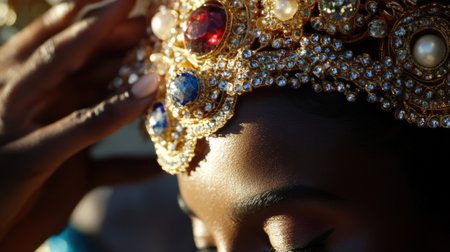 A closeup of a bejeweled headpiece being p on an actors head capturing the moment as a stylist carefully aligns the ornamental details ensuring that the costumes theme harmonizes beautifull