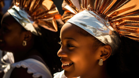 Glittering headdresses and costumes twirling in the Bahian Carnival in Salvador, vibrant under the sun.