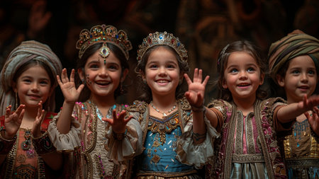 A group of young girls smiles excitedly while attending a fashion show, dressed in bright outfits and colorful accessories. The atmosphere is filled with energy and anticipation.