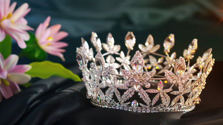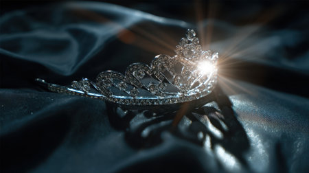 A stunning close-up of an elegant silver tiara adorned with sparkling diamonds, resting on dark satin fabric, embodying royalty and opulence in a captivating scene.