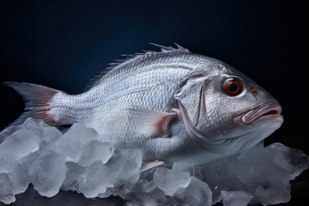 Close-up of a whole fresh fish chilling on crushed ice, ready for culinary use