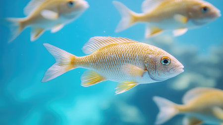 A group of fish swim through the ocean water with details in a close up shot. The image shows a fish with yellow fins with the other in the background. Coral can be seen along the left side. The lighting is diffused, suggesting a submerged environment with a naturalistic aesthetic suitable for various applications.