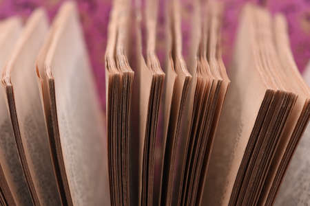 Macro view of book pages on colorful paper background. Copy space for text