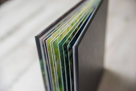 Side view close up of thick and rigid wedding album pages in a book. Blank empty room space for text or copy.