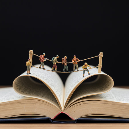 Photorealistic miniature scene featuring travelers crossing a rope bridge on an open book, symbolizing a fantastical adventure. High detail and clean aesthetic, rendered in 8k.