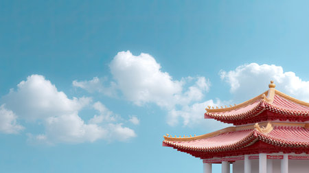 Japanese temple with oriental pattern over sky with clouds, created using generative ai technology. Architecture, culture, religion and tradition concept digitally generated image.