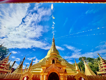 A beautiful golden pagoda rises against a clear blue sky, showcasing stunning architecture and cultural significance. Ideal for travel and heritage themes.
