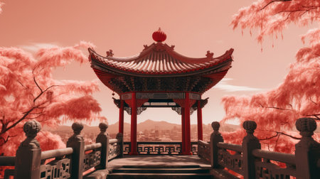 A stunning Chinese pavilion stands majestically amid vibrant cherry blossoms, creating a tranquil scene that captures the beauty of springtime. Perfect for travel and nature themes.