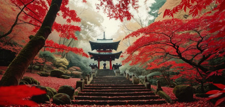 Autumn landscape with red maple trees, pagoda and stone stairs