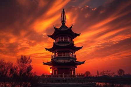 fantastic sunset over a chinese pagoda, with clouds and sky in the background, created with generative ai