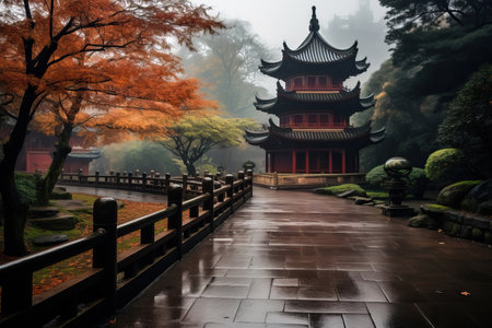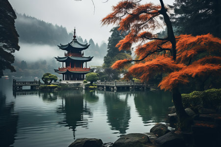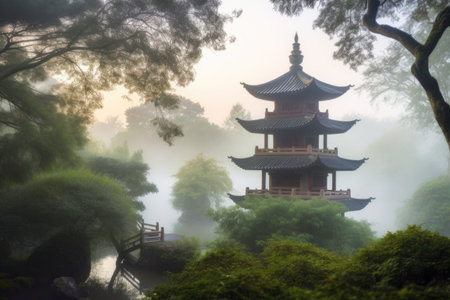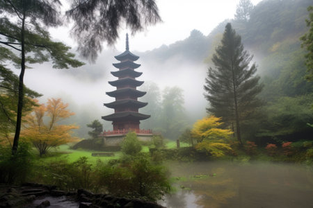 peaceful, misty morning at pagoda with trees and streams visible in the background, created with generative ai