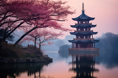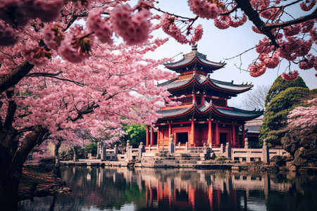 peaceful china pagoda surrounded by blooming cherry blossoms, created with generative ai