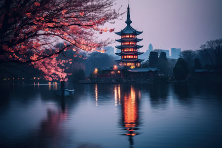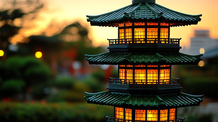 Shining illuminated pagoda in ancient East Asian culture, generated by AI