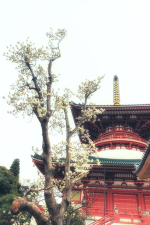Narita, Japan 17 March, 2018: Great Pagoda of Peace and magnolia blossom in the front.