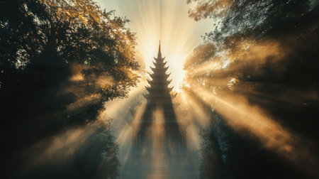 Captivating view of a pagoda at sunrise, surrounded by trees and mist, with sunlight creating beautiful rays of light for a serene and mystical atmosphere.