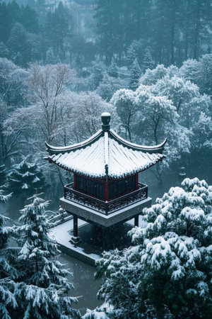 The quiet beauty of the ancient pavilion after the snow, a corner of the winter garden snow scene