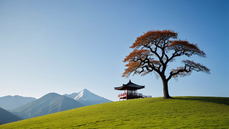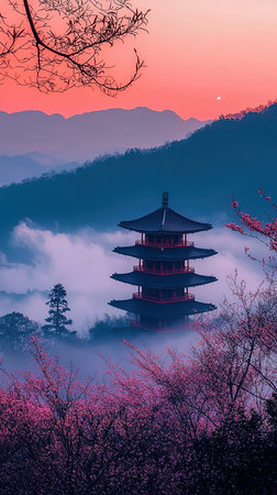 A stunning pagoda stands gracefully amidst lush mountains, creating a peaceful atmosphere. The scene captures a beautiful integration of nature and culture, showcasing vibrant seasonal colors and inviting pathways that lead to serenity and exploration.