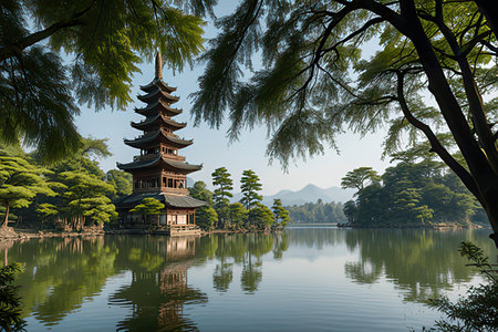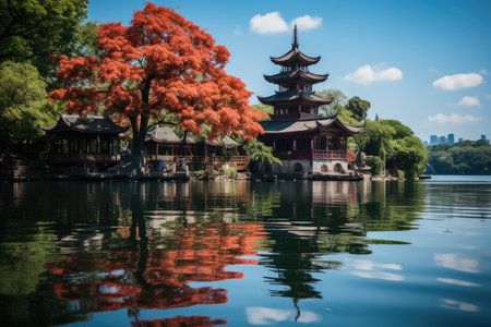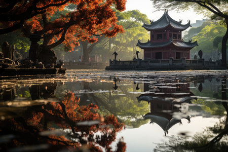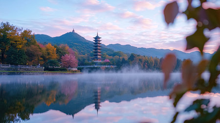 A picturesque scene of a tranquil pagoda nestled by a calm lake, showcasing stunning reflections at dawn. Autumn foliage adds vibrant colors to the serene landscape, creating a perfect backdrop for peaceful moments.