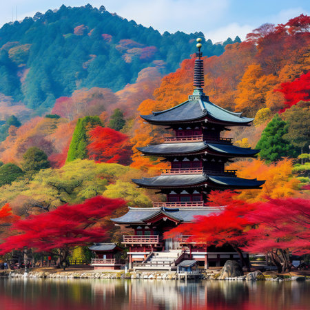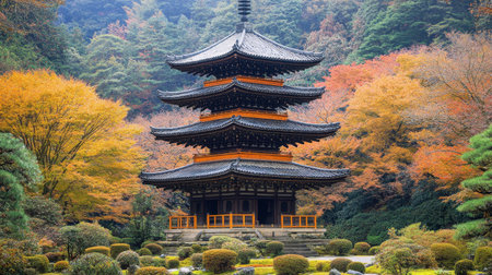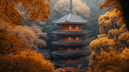 A stunning pagoda stands majestically amidst vibrant autumn foliage. This serene scene captures the beauty of traditional Japanese architecture surrounded by colorful leaves, creating a tranquil atmosphere perfect for relaxation and reflection.