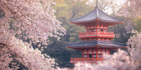 japanese pagoda surrounded by cherry blossom trees, providing a welcome springtime escape, created with generative ai