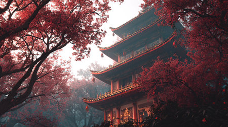 A majestic Japanese pagoda with a vibrant red structure stands tall in a lush garden, surrounded by blooming cherry blossoms in a mesmerizing pink hue. The sky is painted with soft clouds, adding a sense of tranquility to the scene.